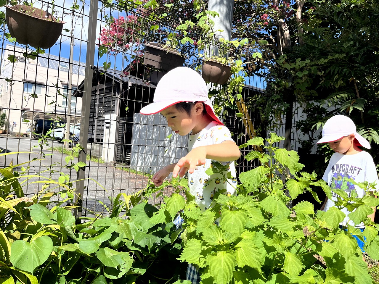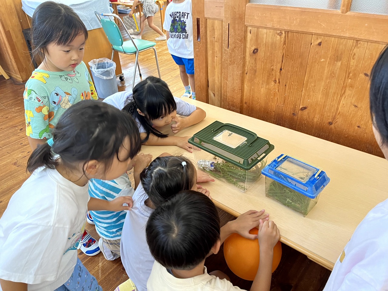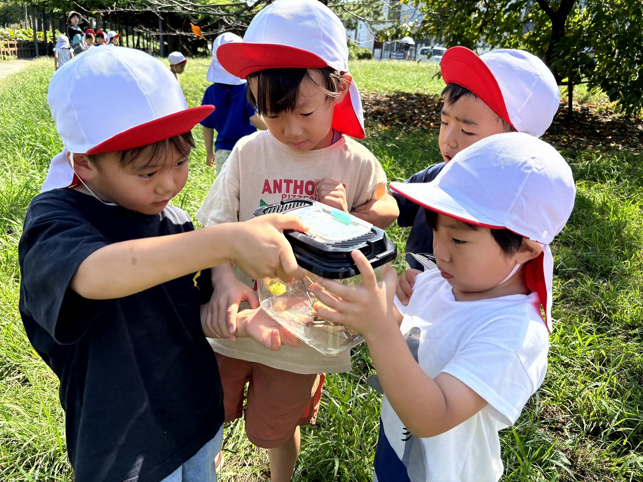 2学期になると、園庭のあちこちでダンゴムシやバッタ、カマキリなどのお目当ての虫を探したり、家の近くで見つけた生き物を持ってきたりして、友だちに見せる姿が増えました。わからないことは図鑑で調べたり、詳しく知っている友だちに教えてもらいながら、興味を深めています。