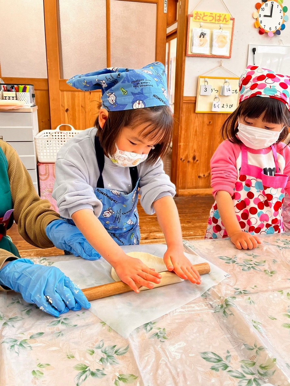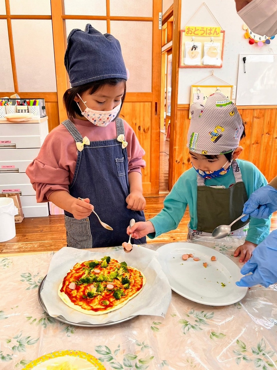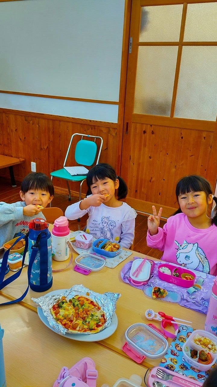 卒園を控えた年長組と残りの生活でどんなことをしたい?と子どもたちに尋ねると「お出かけしたい。」「一緒にお弁当を食べたい。」「お料理したい!」「パーティーみたいなことがいい!」という様々なリクエストがありました。そこで今年のお別れ会は、いろいろ相談を重ねた結果「みんなでピザを作って一緒に食べよう‼」ということになりました。
