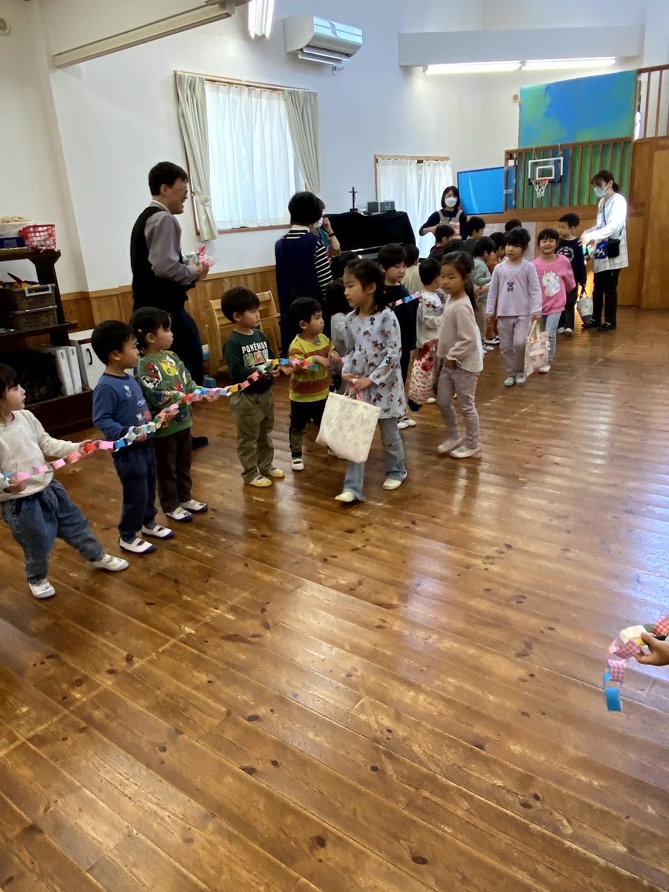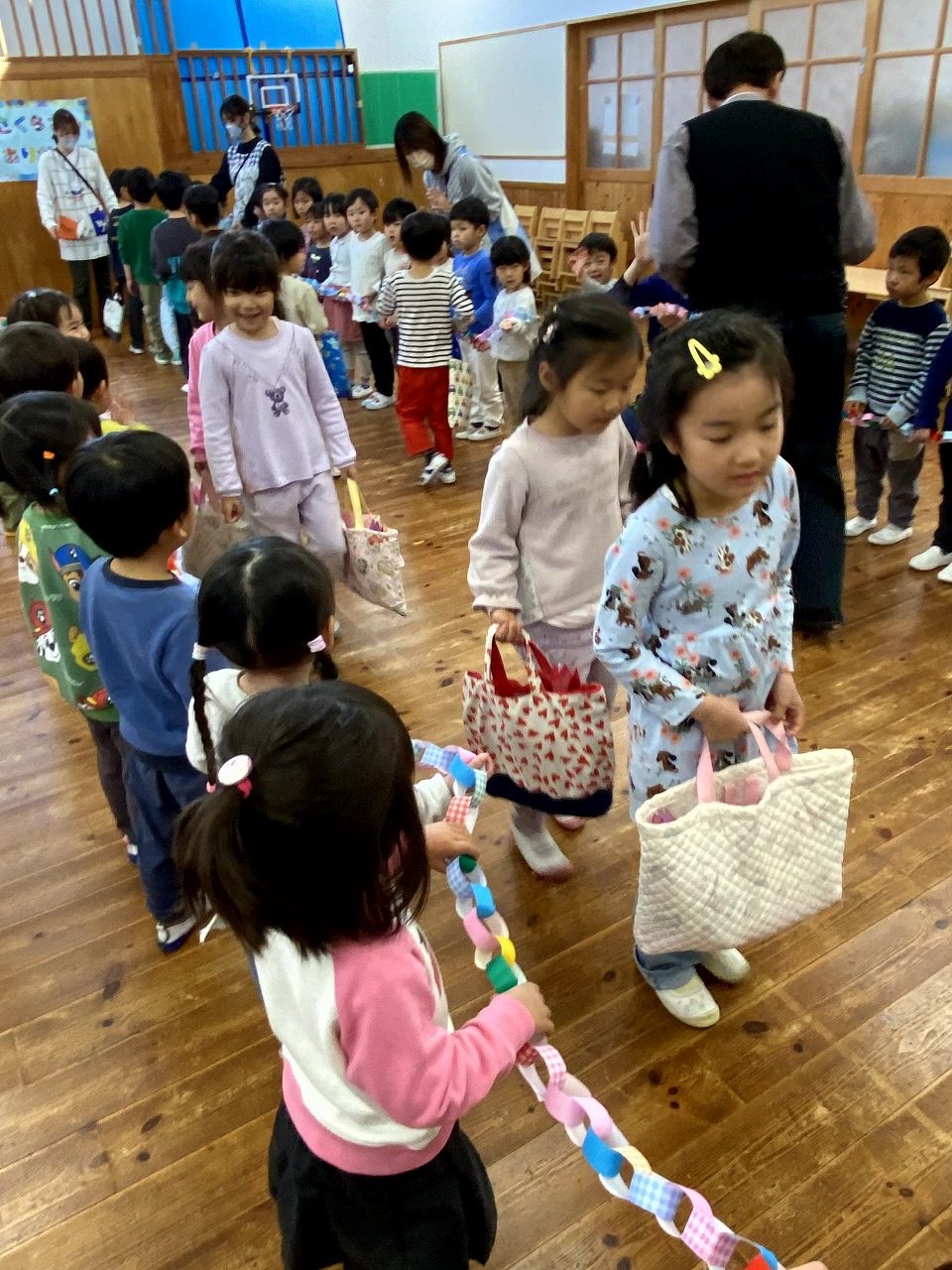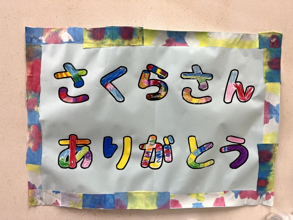 最後に、内緒で作っていた輪飾りの間を通ってもらい、「ありがとう。」「元気でね。」とお見送りしました。