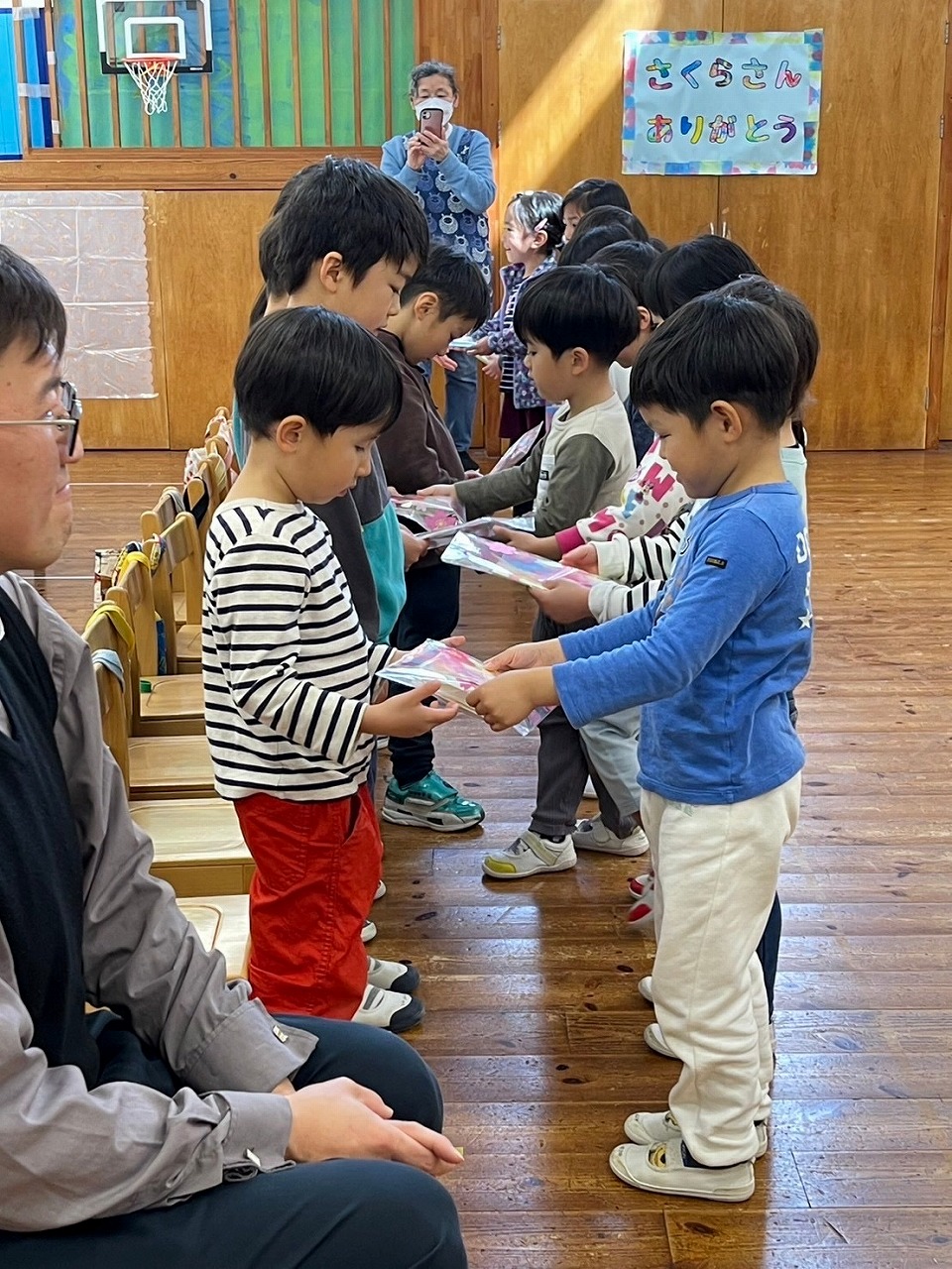 年中・年少・満3歳児の子どもたちが、年長組との思い出を胸に心を込めて作ったプレゼントを渡しました。
