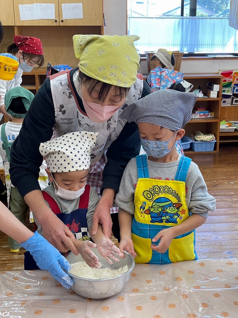 朝から興奮気味の子どもたちでしたが、作り方の説明をしっかり聞いてとりかかります。この日の調理は、初めての縦割りグループです。協力しながらのピザづくりが始まりました。