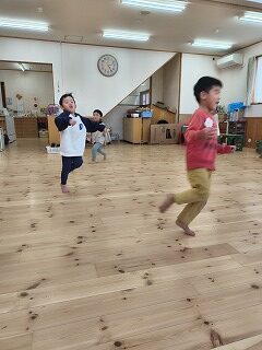 リズムの最後に、学年ごとにもう一度やりたい物を話し合いリクエストできます。初めの頃は、保育教諭が間に入り、話し合いをしていた4歳児も「何がいい?」とみんなの意見を聞き、自分たちで決められるようになりました。代表のじゃんけんで決める5歳児は、「えっ?!ちょっと代表が多くない?」なんて笑い合い決めていました。