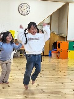 5歳児は、昨年度からの経験があり、ピアノの音で何の動きをするのかすぐに分かります。その動きを見て、「次はあの動きをするのだな!」と目を輝かせて待つ4歳児です✨