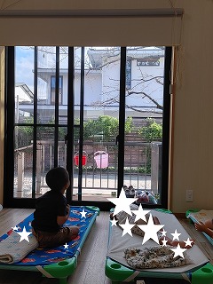 午睡している保育室の大きな窓から、園庭の桜の木が見えます。