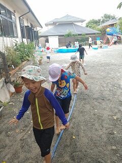 にじ組では、毎日のように水遊びを楽しんでいます。スーパーボール、水風船、氷…いろいろなもので、夏の水の気持ち良さを感じています。