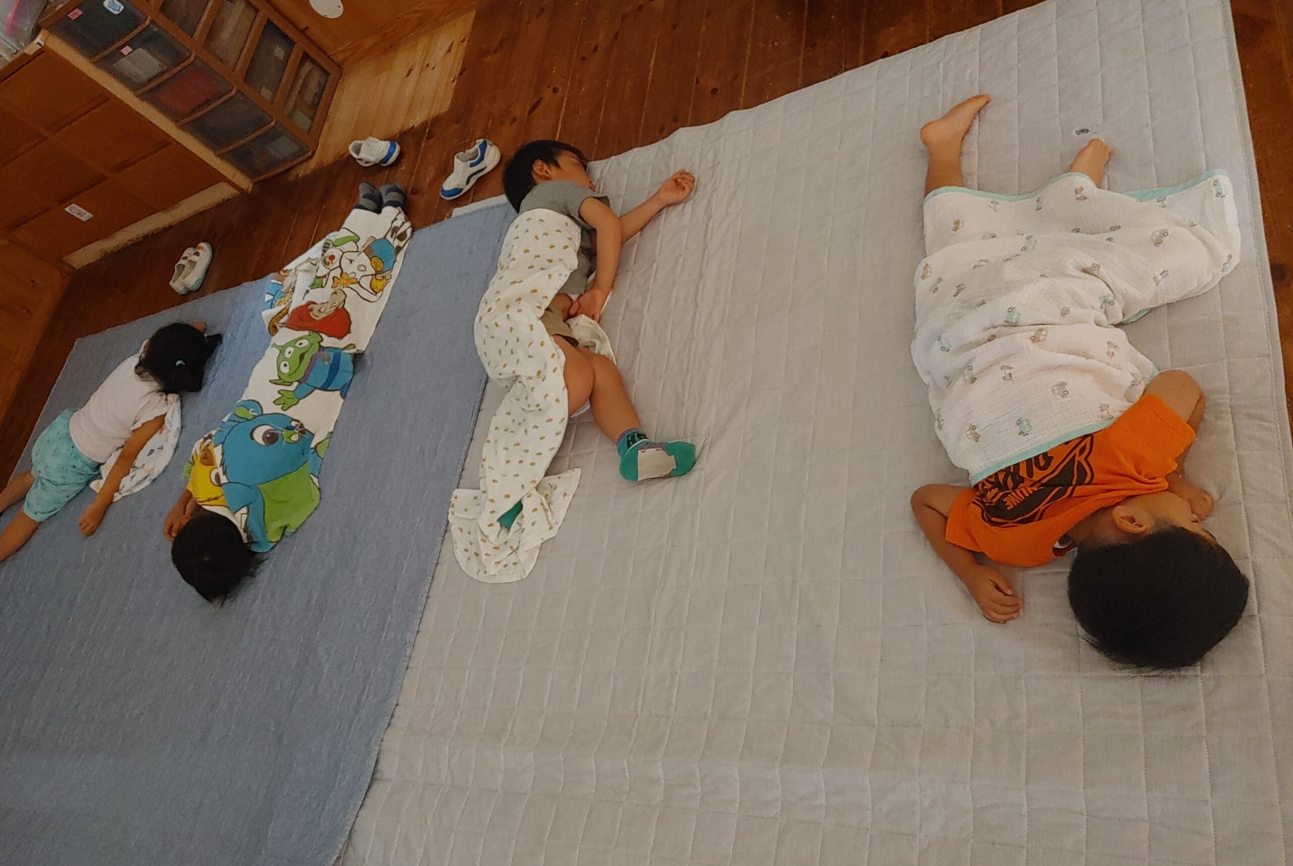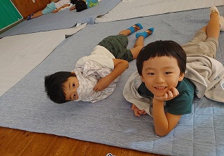 たくさん遊んだ後は、お昼寝です。この時期は年中・年長組のお友だちもゴロゴロしながら寝る子がいます。寝なかった子は、静かに保育室に移動。少しでも横になる事で、体調が回復しすっきり元気に過ごせます。