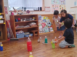 ペットボトルを縦に並べてみたり、重ねてみたり、「ボーリングみたい!」とボールを作ってみたり…遊びが動いていくのです。近くで見ていて楽しいですよ!