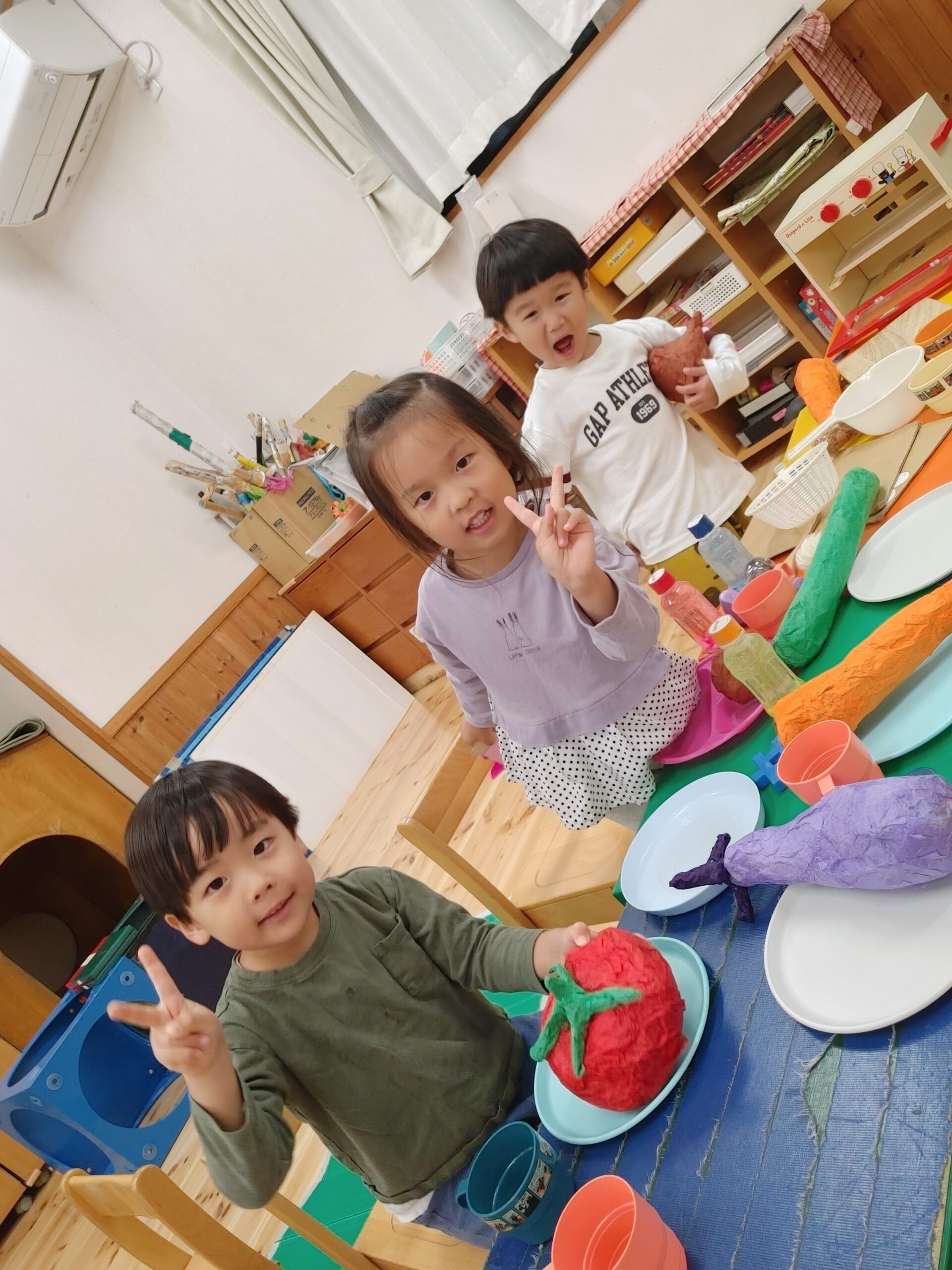 買った野菜に塩をかけて食べていたのですが、4歳児のBちゃんが「ねぇ、野菜パーティーにしよー!」の提案で、せっせと椅子を並べ、「椅子の数だけコップがないんだよ~。」と、あちらこちらのままごとコーナーから集めてくるC君。「僕は大人だから、ビール飲もーう。」とD君。賑やかなパーティーの気配でした♪