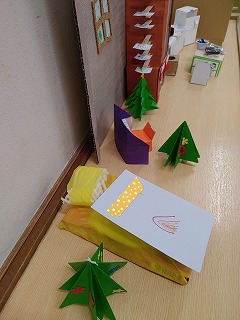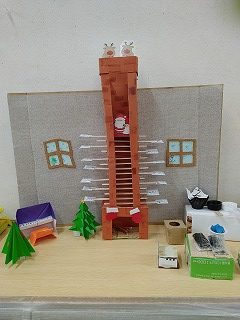サンタクロースが少しずつ煉瓦の煙突を降りてくるのですが、周りのお家の装飾は子どもたちが作ってくれました♪