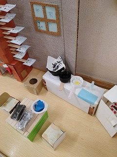 お風呂やゴミ箱、日に日に増える子どもたちの面白いアイデアの飾りに賑やかになる煉瓦のお家です。