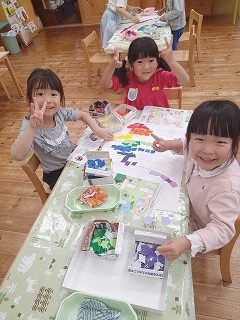雨の日の遊びの時間、カエルの製作が出来るよう準備をしておきました。