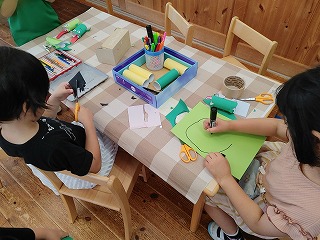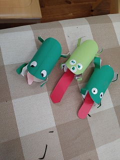 ながーい舌をつけたり、目玉が3つのおばけガエル、餌も作ろうと図鑑を持って来てハエを作る子もいました。