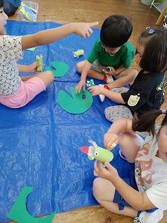 作ったカエルで遊ぶ子どもたち