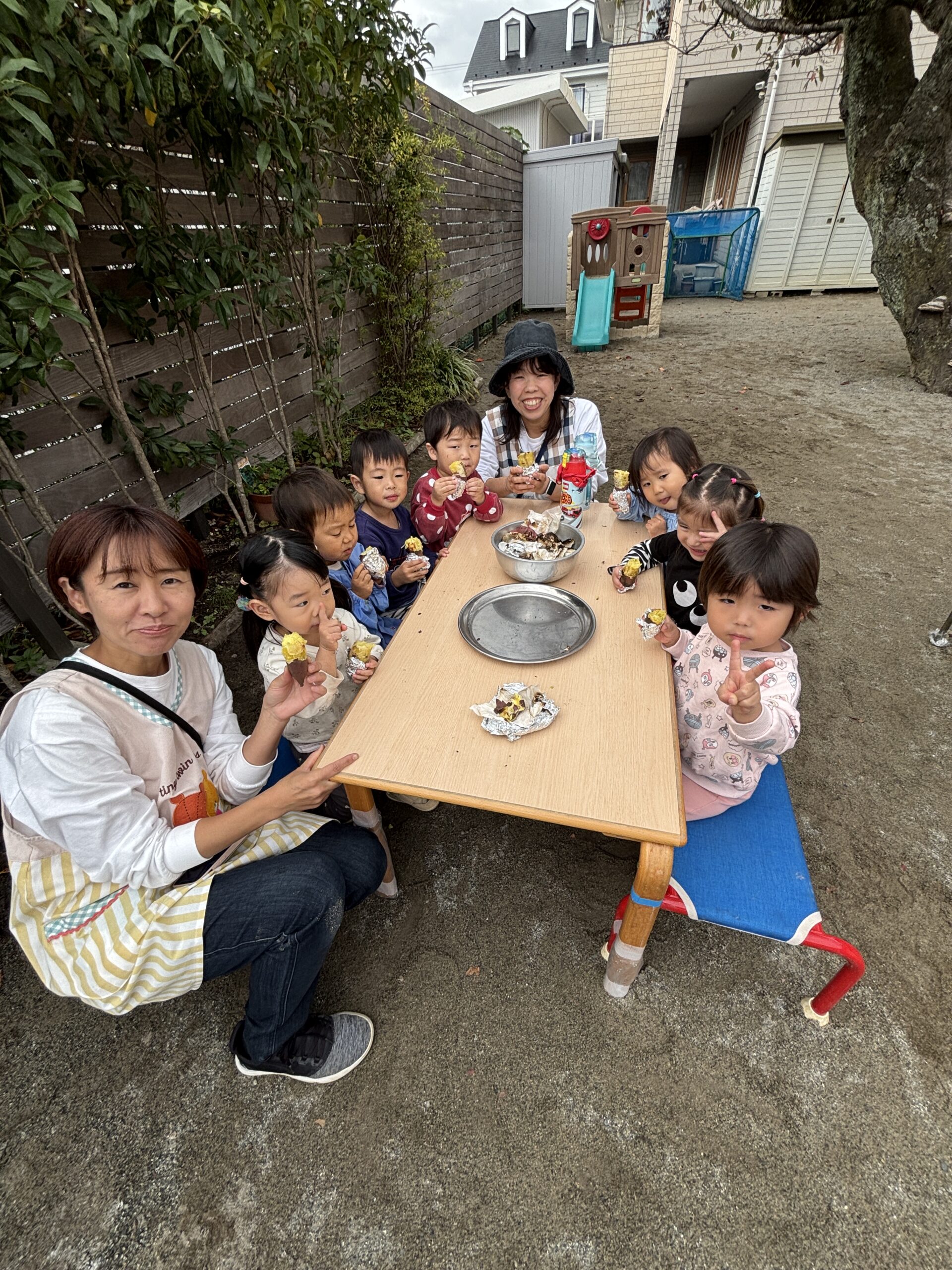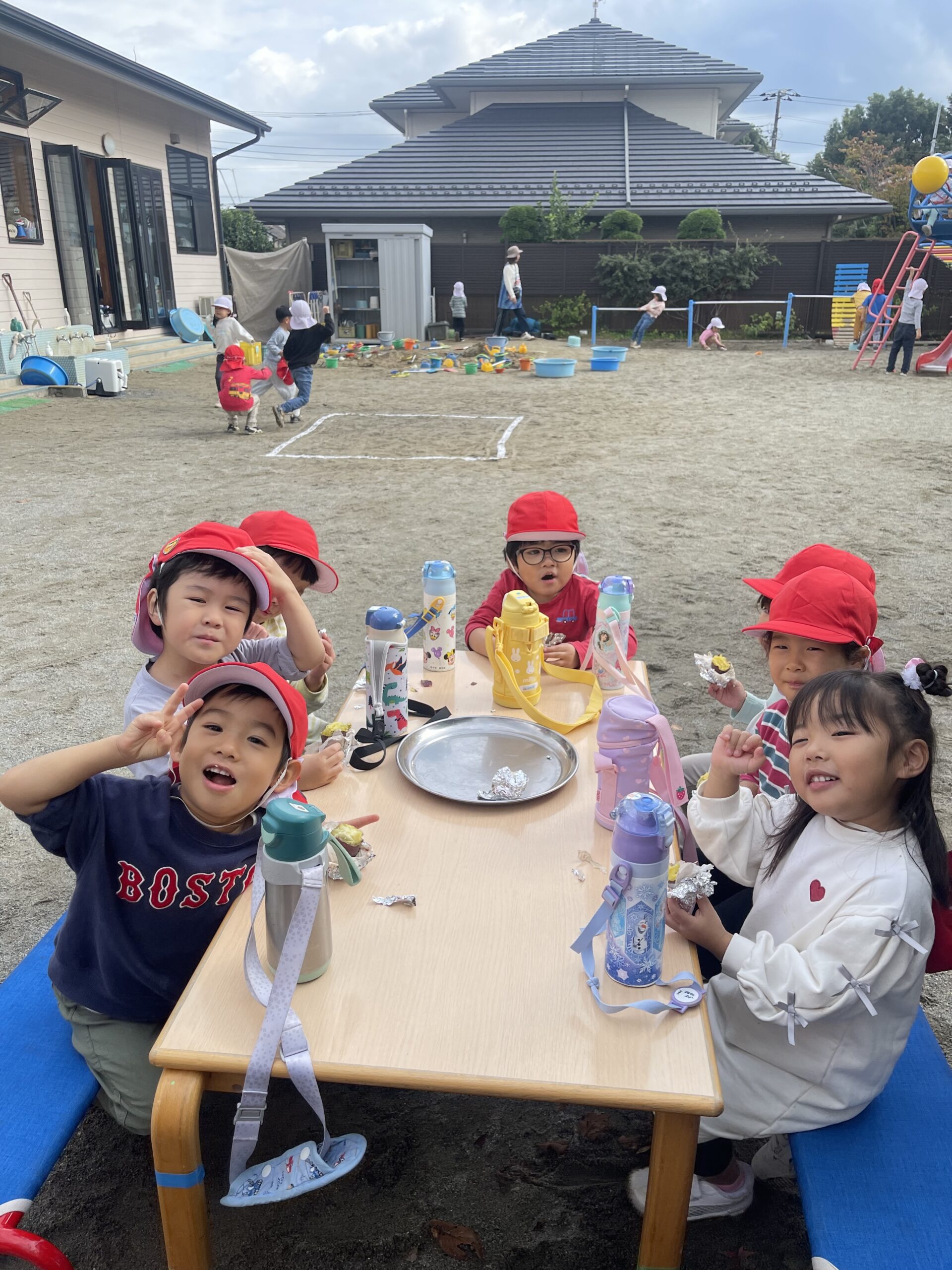 焼きたのてお芋は特別の味!収穫の喜びをみんなで味わいました。