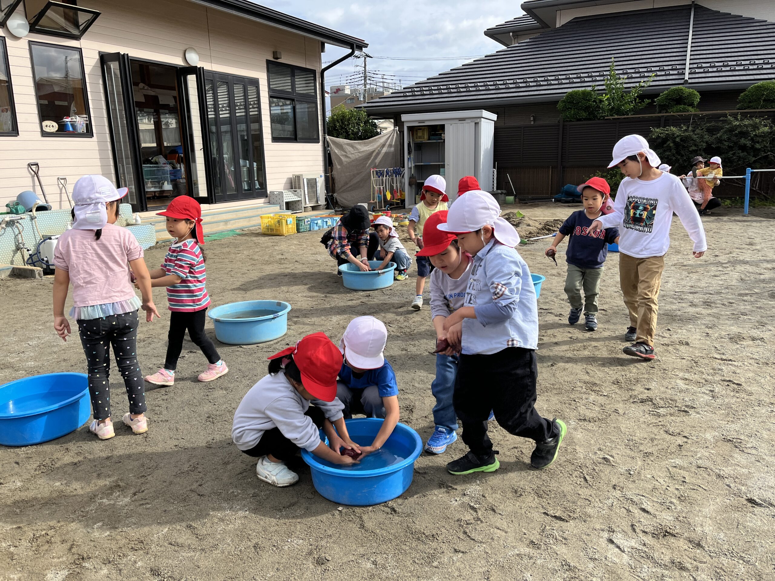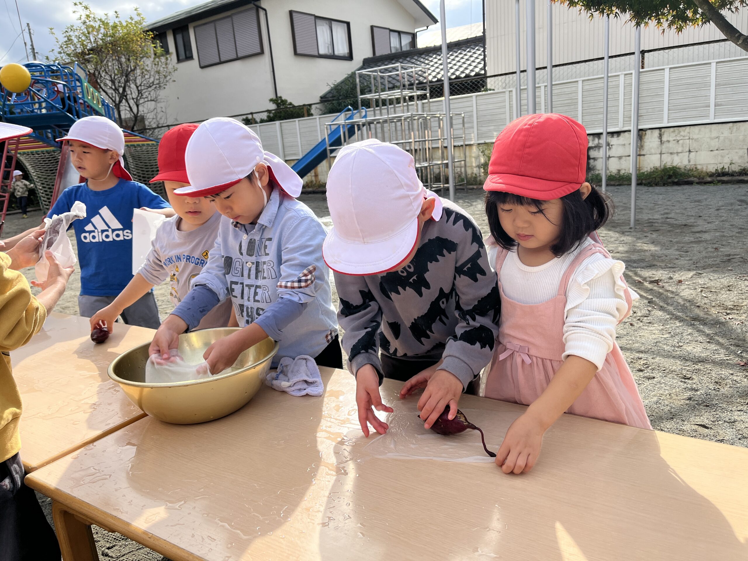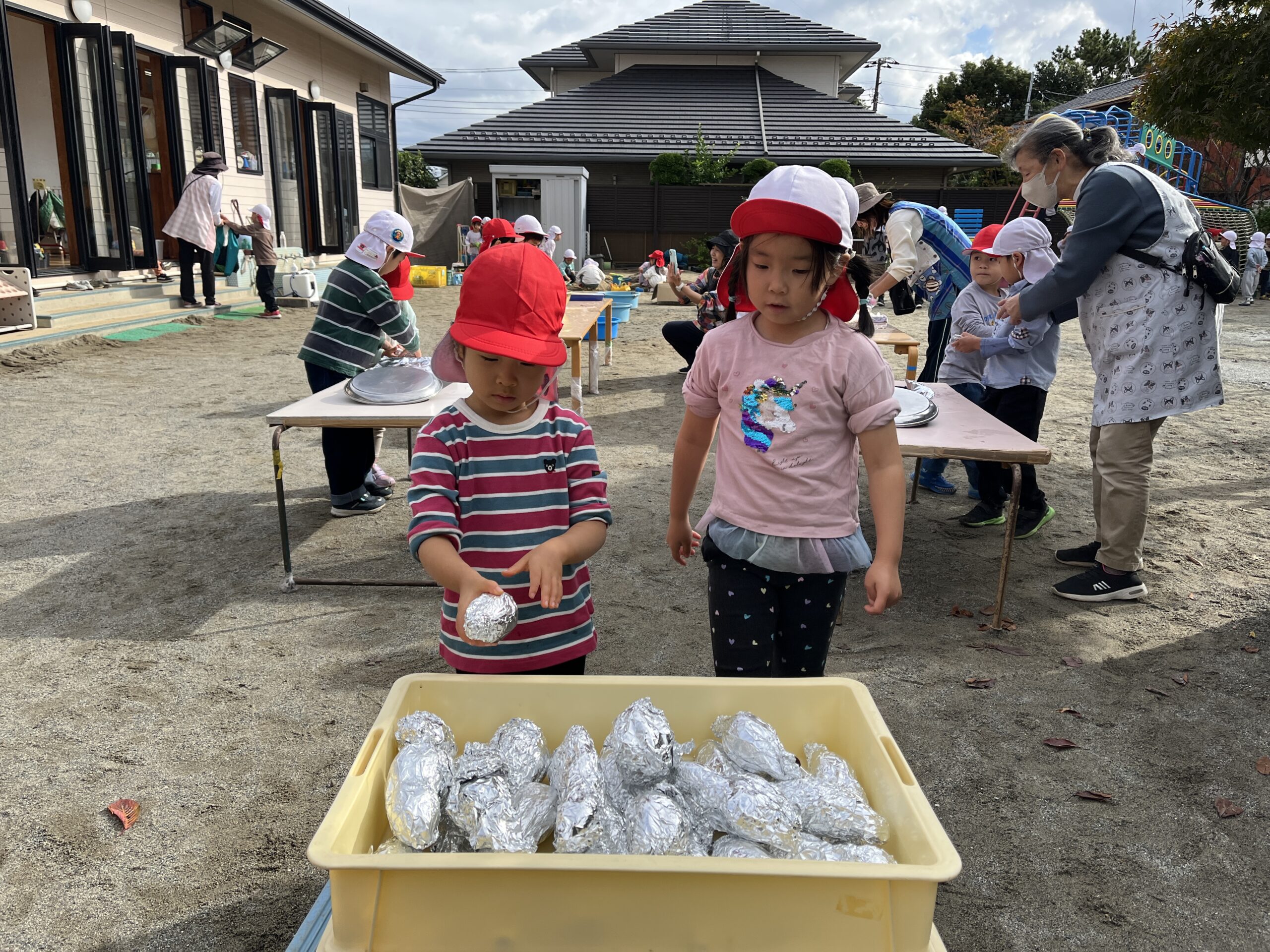 桜の葉が紅葉し落ち葉になって園庭を彩り始めた11月中旬、みんなで焼き芋をして食べました。お芋は4・5歳児がバスに乗って久野に行き掘ってきたものと、2・3歳児が園の小さな畑で掘ったものです。子どもたちの手で最初から準備を始めました。