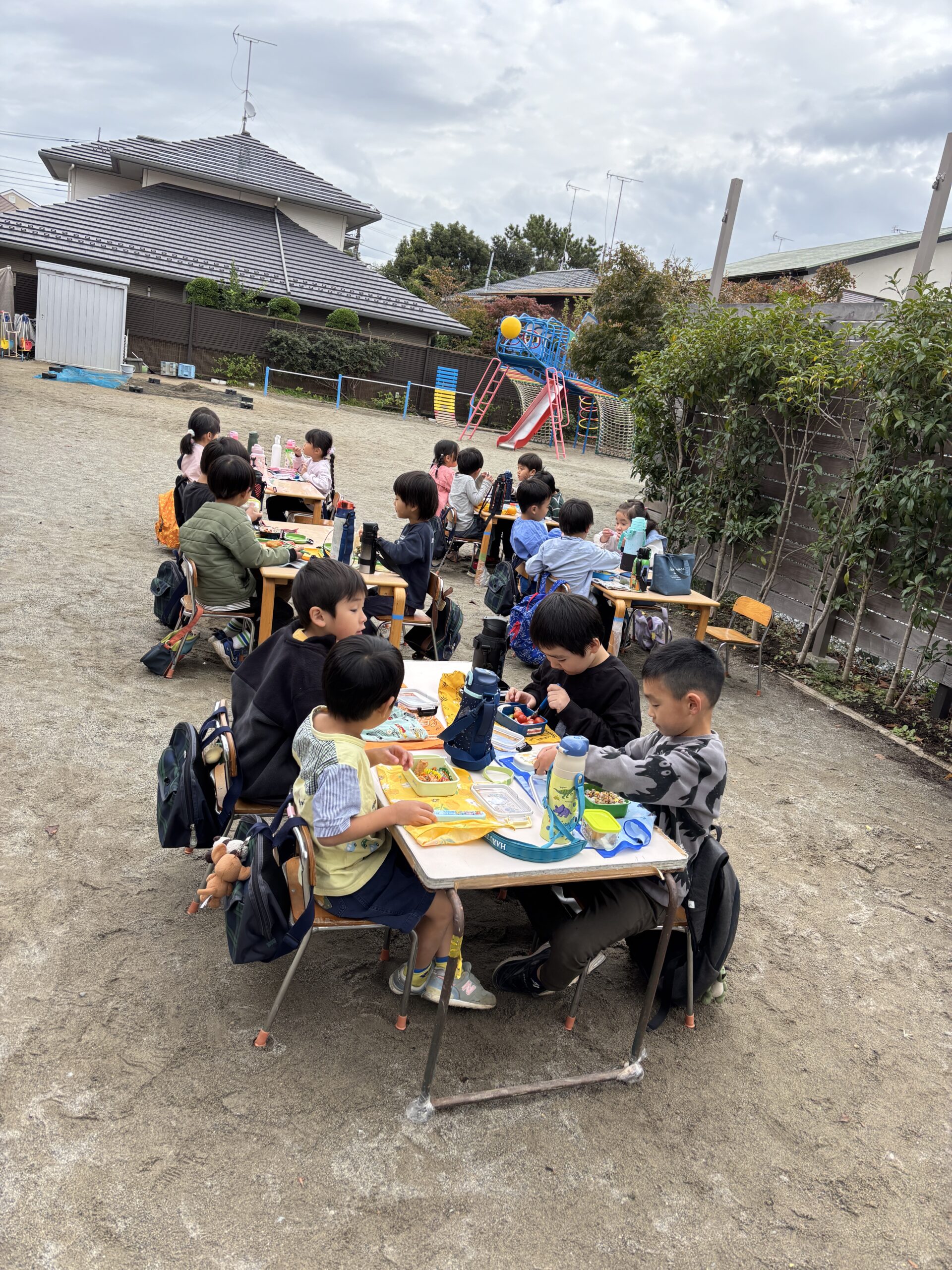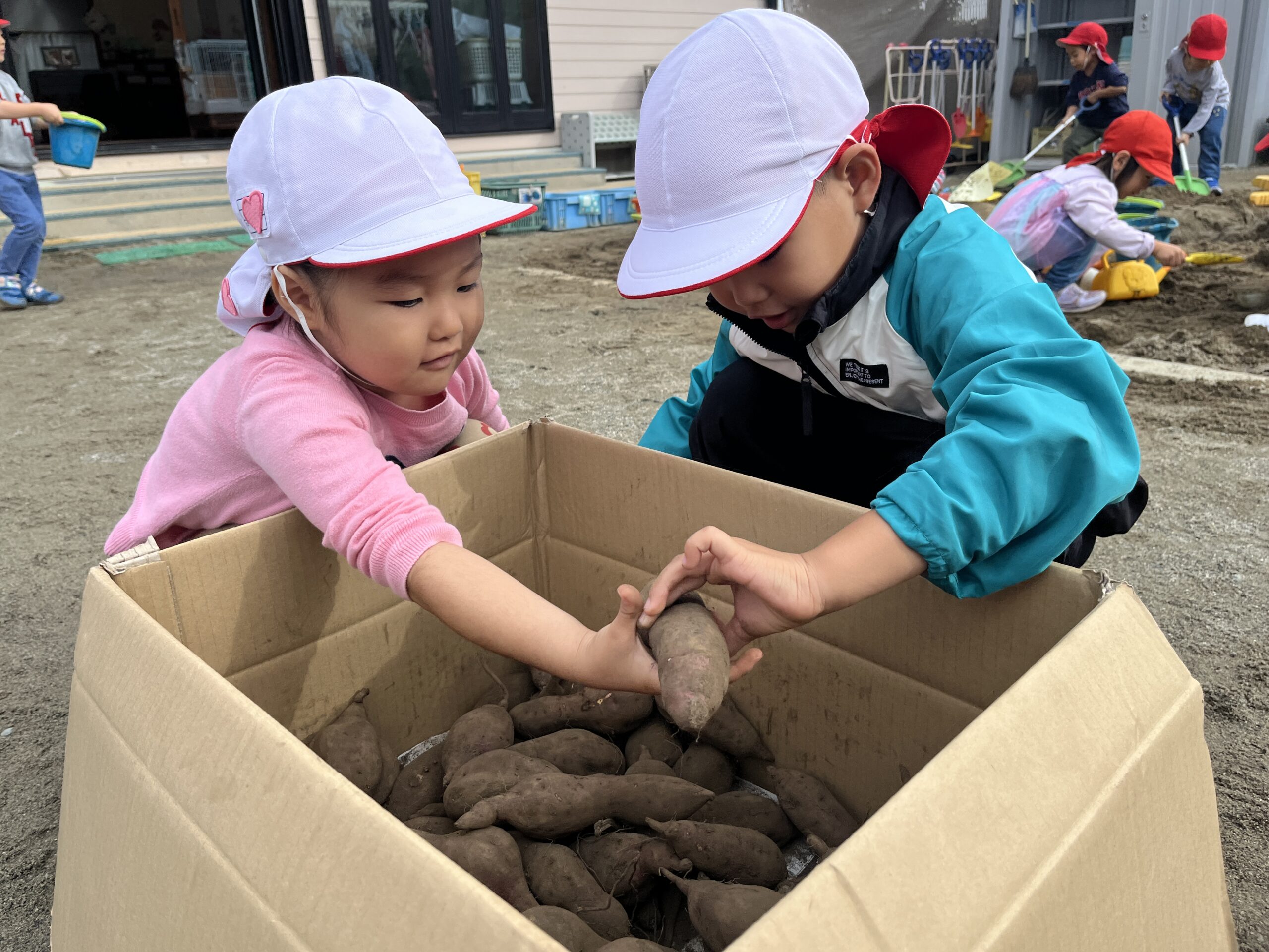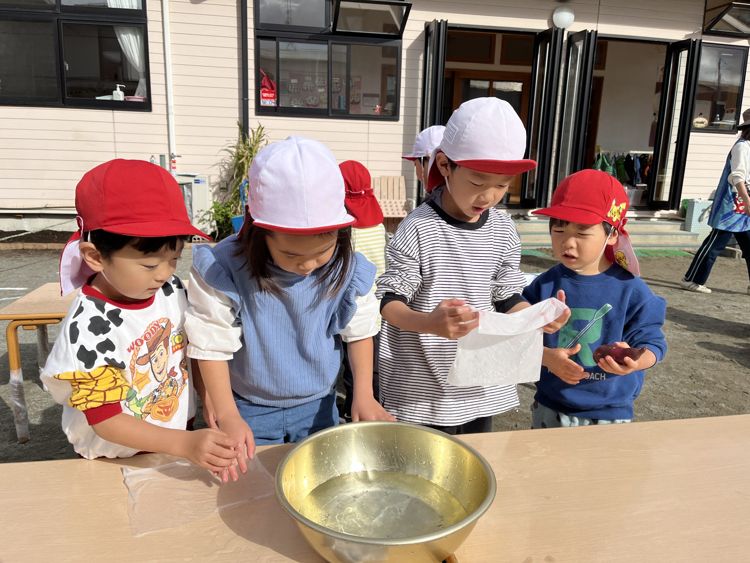 桜の葉が紅葉し落ち葉になって園庭を彩り始めた11月中旬、みんなで焼き芋をして食べました。お芋は4・5歳児がバスに乗って久野に行き掘ってきたものと、2・3歳児が園の小さな畑で掘ったものです。子どもたちの手で最初から準備を始めました。