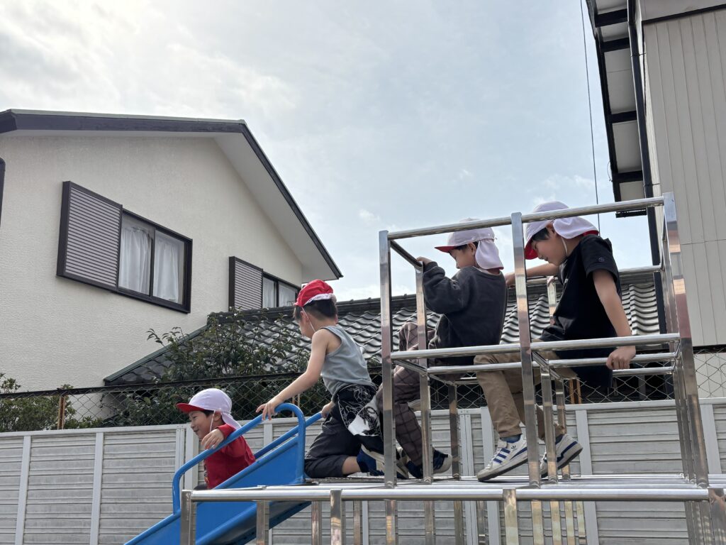 鉄棒、雲梯、登り棒も、すぐにクリアできる子、何度もチャレンジする子、チャレンジすることをためらう子と様々ですが、友だちの影響を受けて頑張っています。