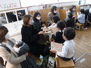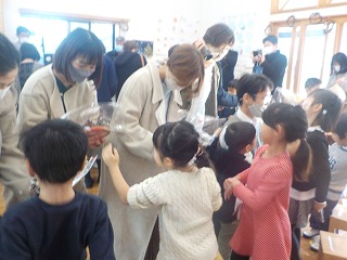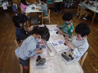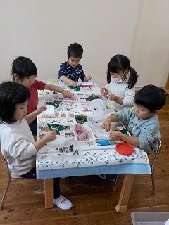 こちらは大好きなお家の方に向けて、プレゼントやカードを作っているところです。それぞれが小さな手を動かして、一生懸命取り組んでいました。