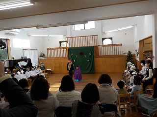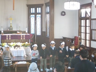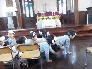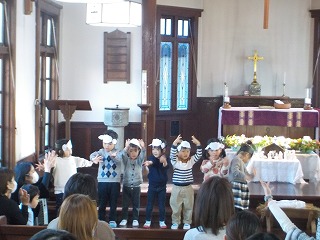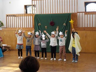 4・5歳児は礼拝堂でろうそくを灯して礼拝を守った後、聖劇と祝会を行いました。