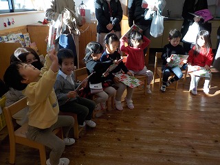 翌週の遊びの時間では、それまで憧れの眼差しで見ていた小さいクラスの子どもたちも、衣装を着て劇ごっこに参加していました。お兄さんお姉さんたちの歌と動きをよく見聞きして覚え、生き生きと楽しんでいました♪