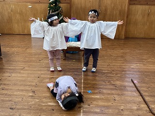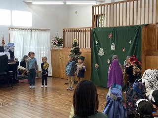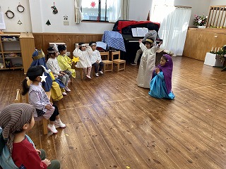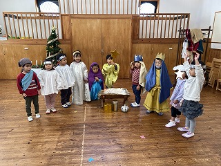 年中長組は、イエス様のお誕生を劇にして演じます。毎日少しずつ歌や動き、せりふなどを覚えて、お家の方と過ごすクリスマス礼拝の日を楽しみに過ごしていました。