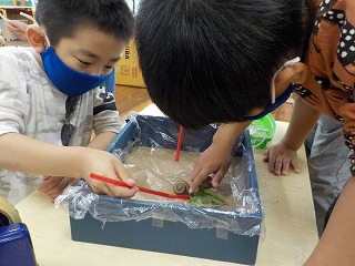 さらに、ここにかたつむりも仲間入りしました。興味津々の子どもたちが集まってきて、そーっと触ったり、ストローや麻ひもに這わせて様子を観察したりと、すっかり親しんでいます。(触れた後は、石鹸で手洗いするのも忘れずにしています。)