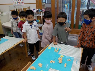 たくさん触れ合った後、年長組では小麦粉粘土でかたつむりを作ってみることにしました。