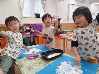 「ぼくたちが作ったんだよ!あの曇も絵の具をポンポンして作ったんだよ。」と自信満々の年中組のA君。やりたかったんだもんね✨