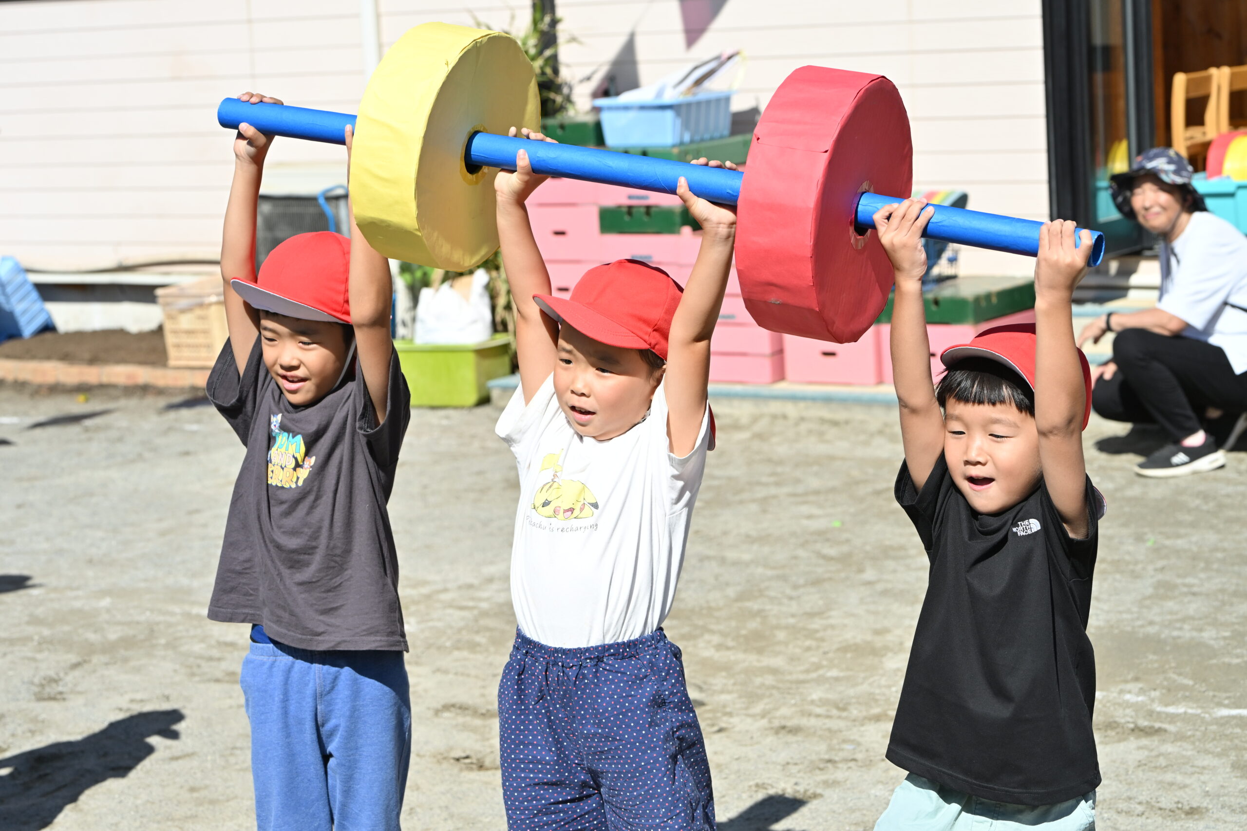 3歳から5歳の縦割り競技は、3人でマッチョを目指してゴール!