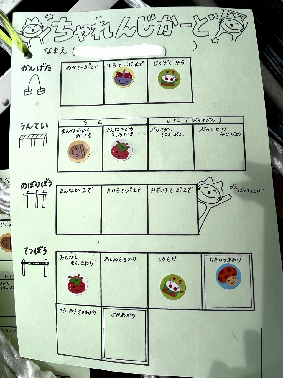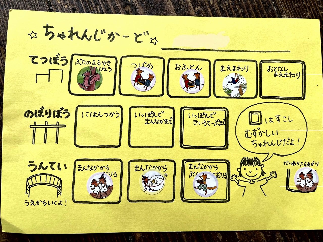 ただ、なかには苦手意識からあまり積極的になれないことも…でも、まずは挑戦してみることが大事!という思いから「チャレンジカード」を用意しました。すると、頑張ってみようとする姿が増え、時にはみんなで励まし合いながら繰り返し取り組んでいます。