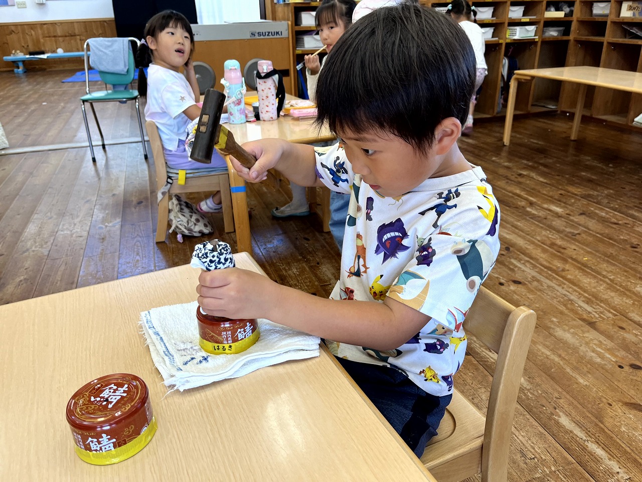 また、年長組は釘と金づちを使って缶に穴を開け、昔ながらの缶下駄を作りました。