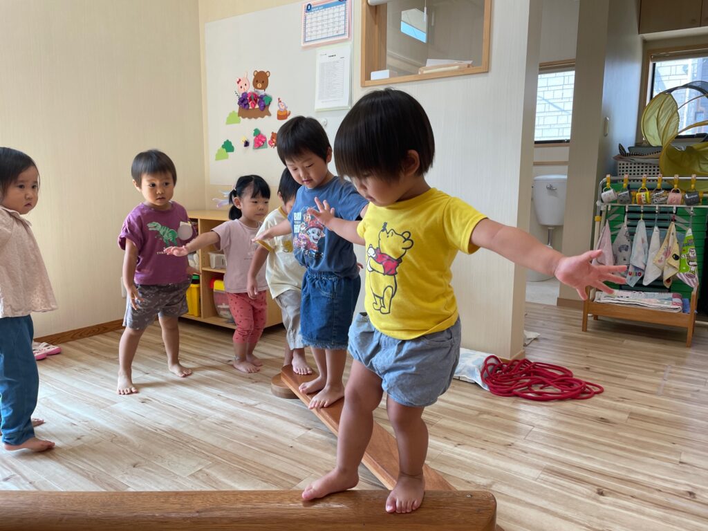 暑くてお外に出られない日はちょっと変わった室内遊びもしてみよう、と平均台遊びもしました。
