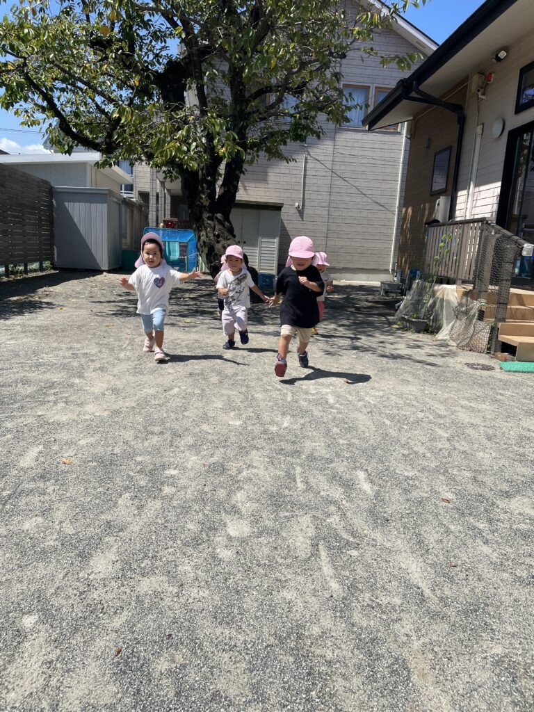 お外遊びの後はいつもみんなが大好きなよーいどん!をしてお部屋に戻ります。